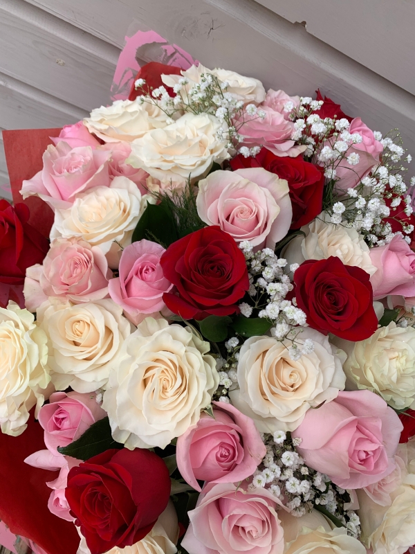 Marvellous mix, a beautiful mixture of red, white and pink roses accompanied by seasonal foliage. This aqua pack bouquet comes gift wrapped and in water, for instant display.
